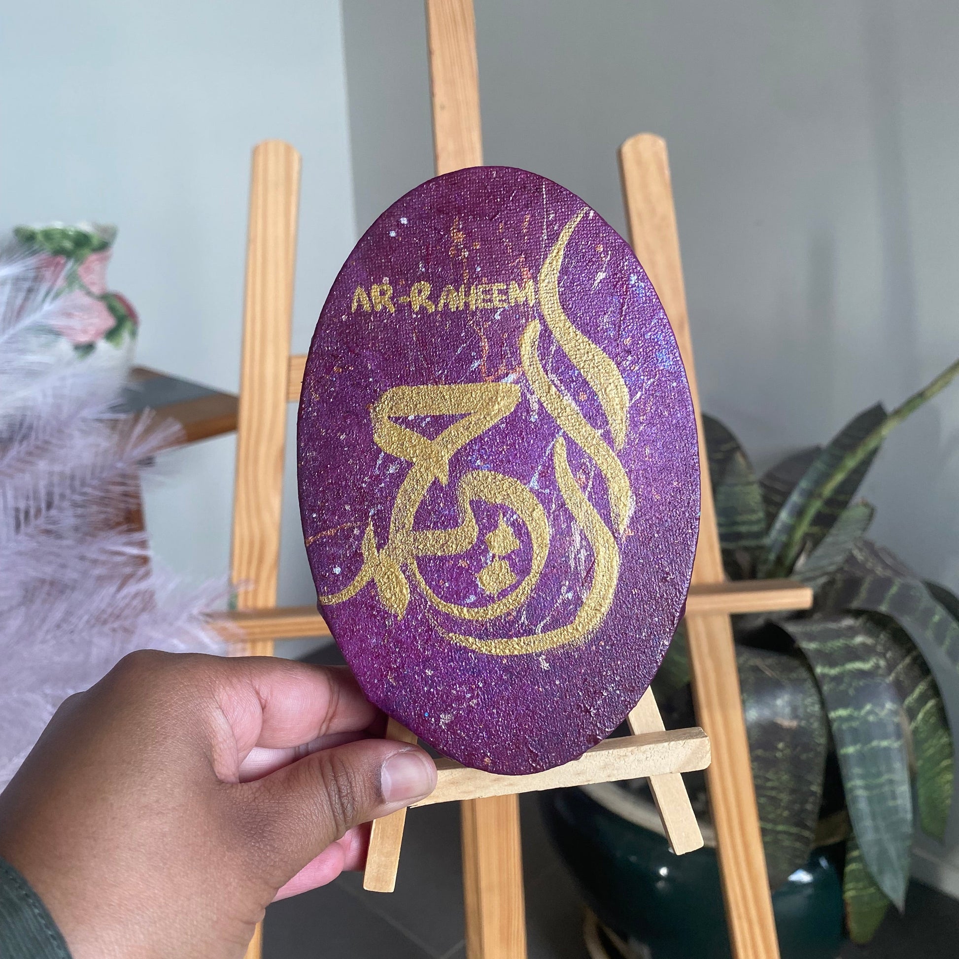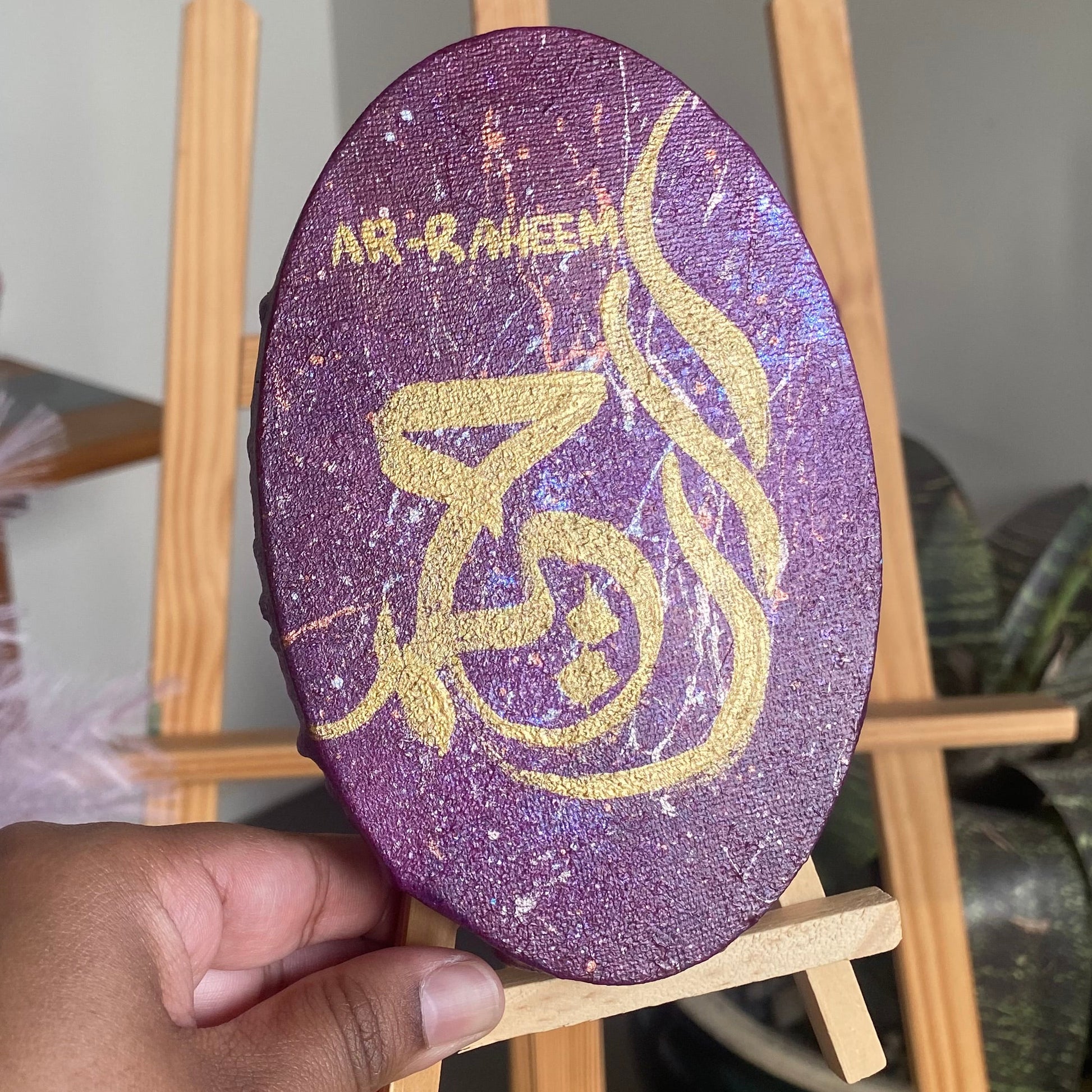 This painting embodies the gentleness and divine closeness of Allah’s compassion through its rich, deep purple hues, symbolizing spiritual depth, devotion, and divine love. The golden calligraphy of "Ar-Raheem" stands boldly against this celestial backdrop, shining like an eternal promise—a reminder that Allah’s mercy is not fleeting, but continuous, nurturing, and infinitely close to those who call upon Him.
