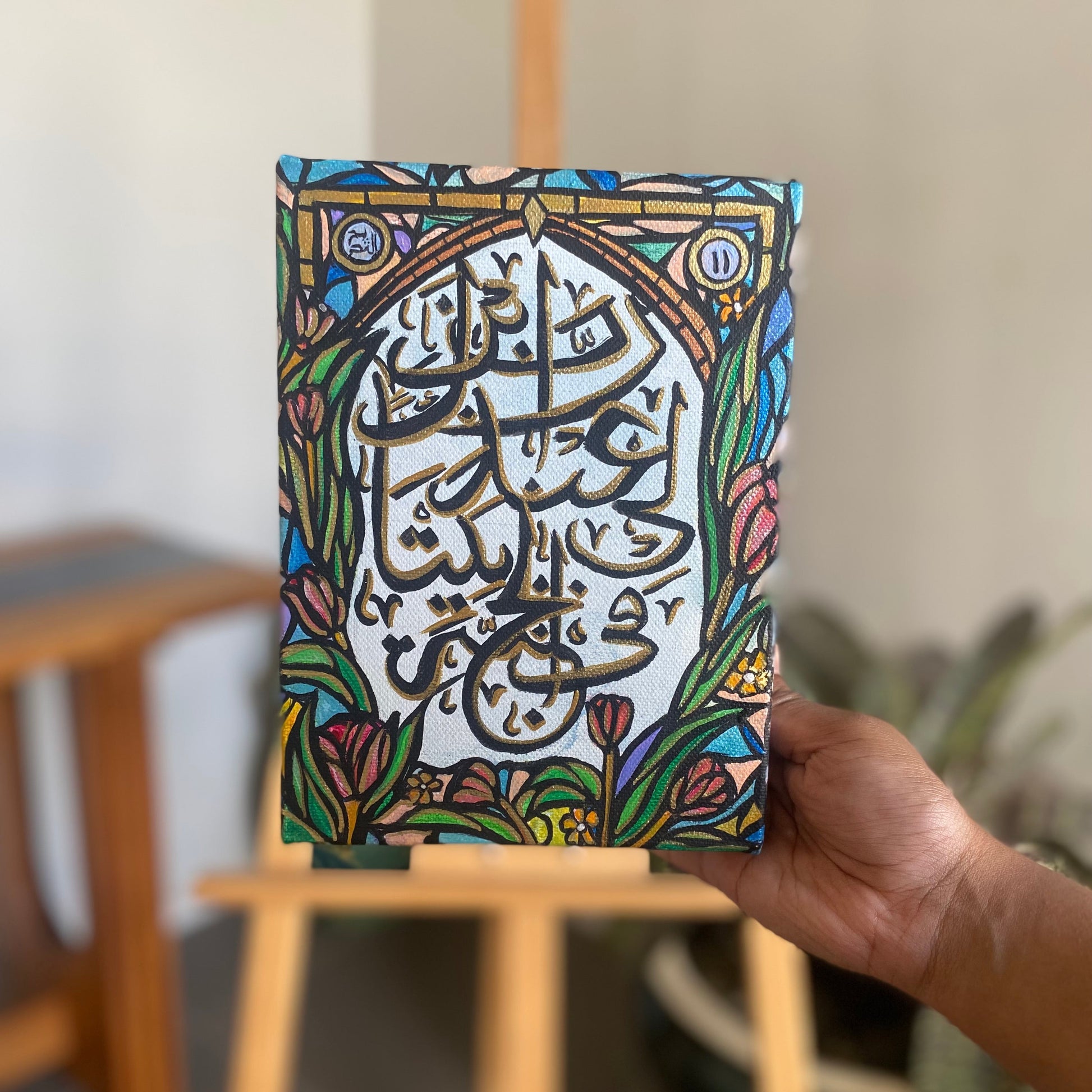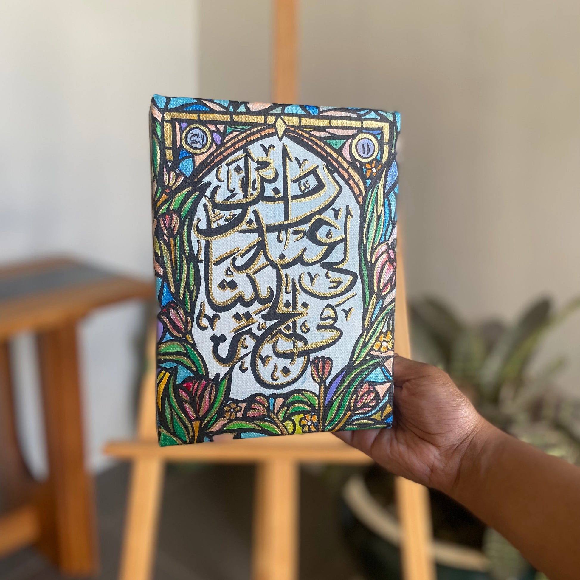 This painting began as a heartfelt prayer — a quiet plea for eternal closeness to Allah. Inspired by the radiant beauty of stained-glass windows, the intricate background wraps softly around the entire canvas, symbolizing how faith filters through every part of our lives.